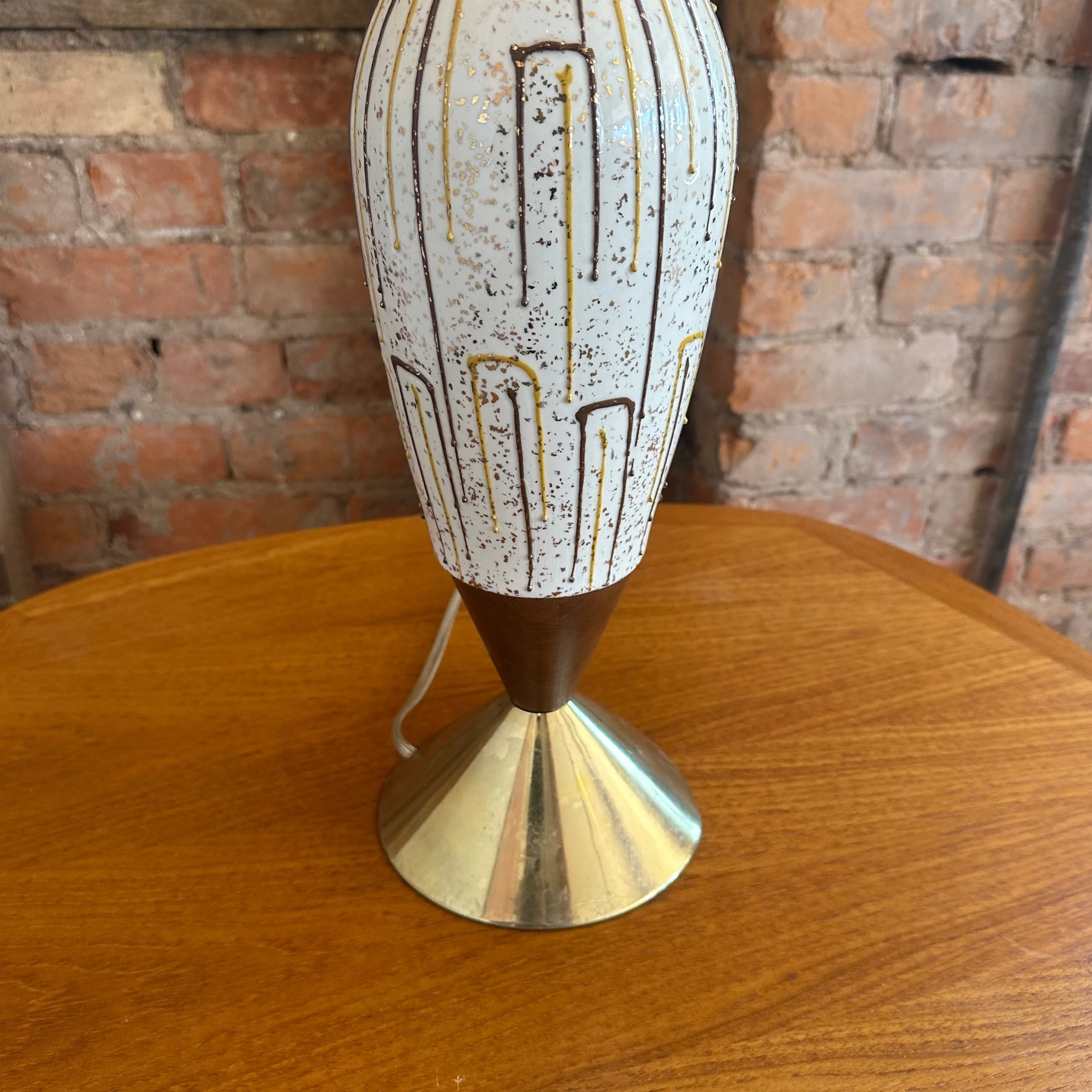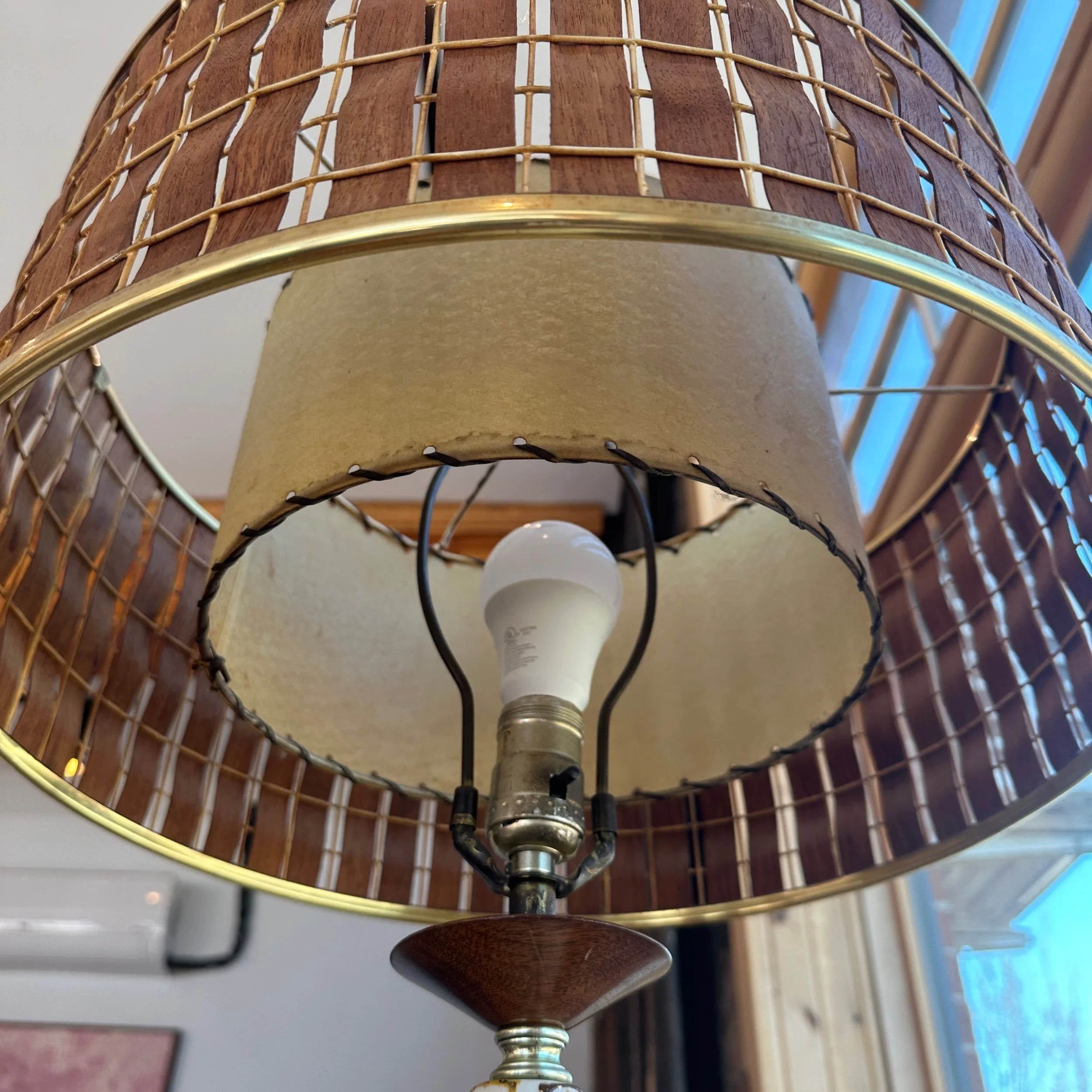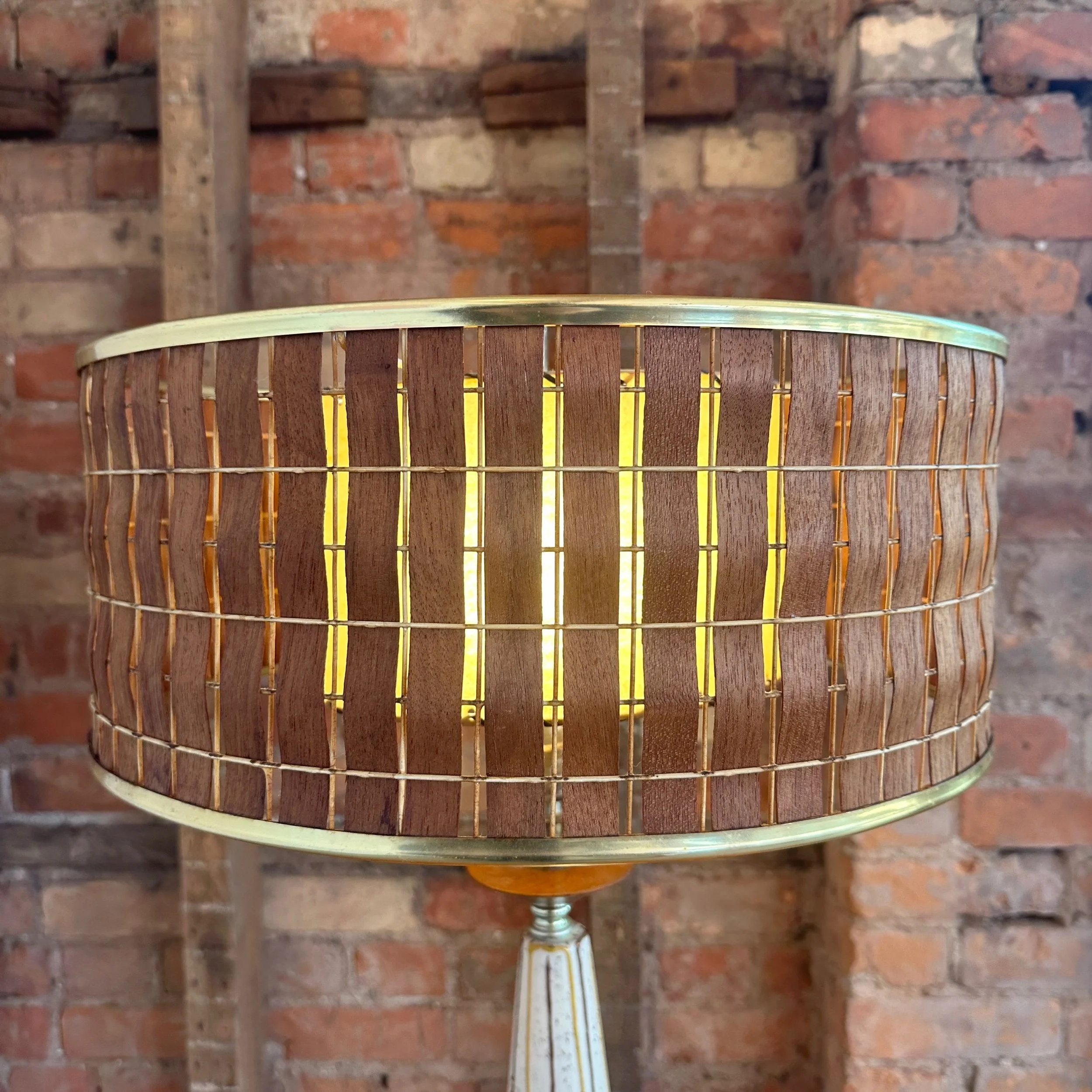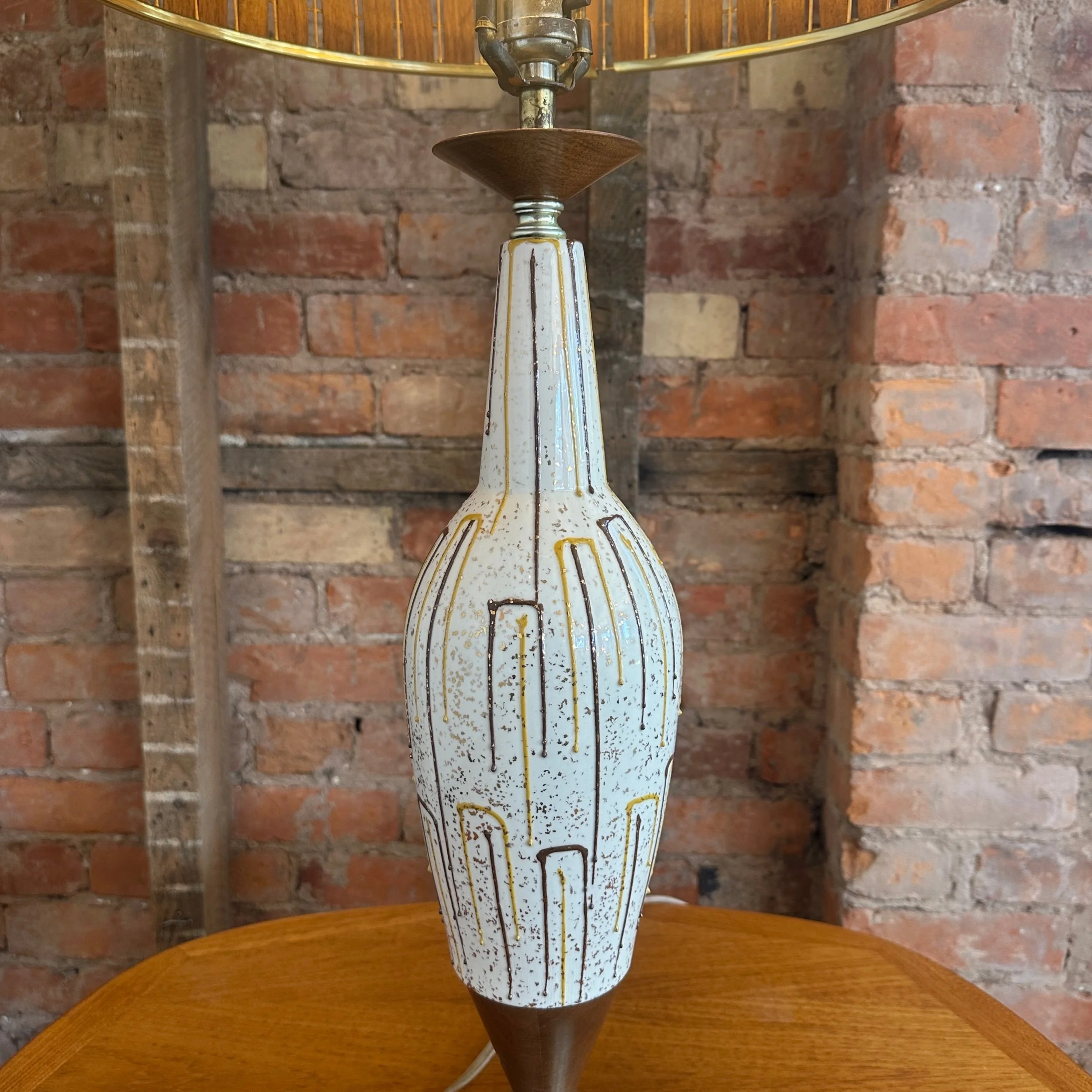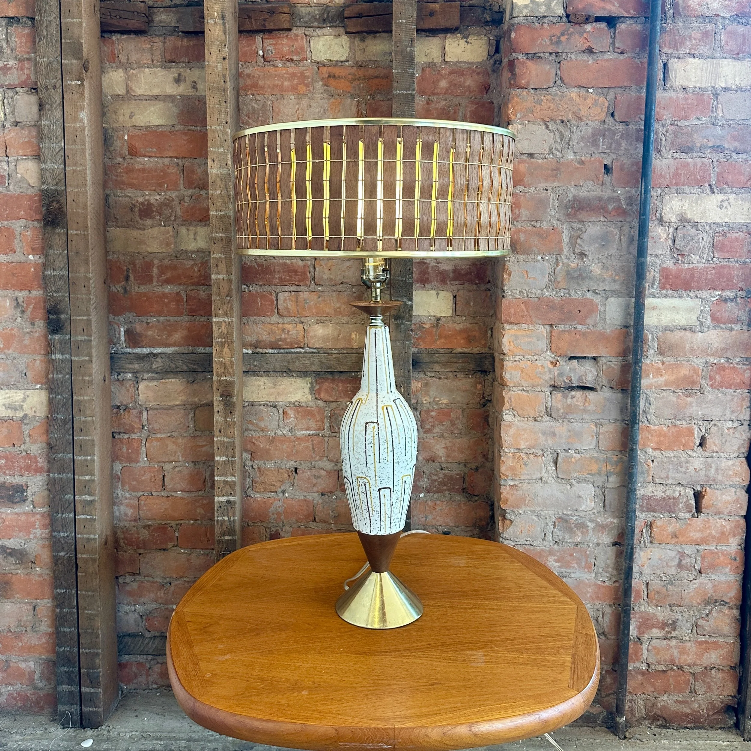 A beautiful mid-century modern ceramic and walnut lamp. The stunning 1960s piece is in beautiful condition and features brass accents with a woven walnut lampshade and a inner fibreglass lampshade.