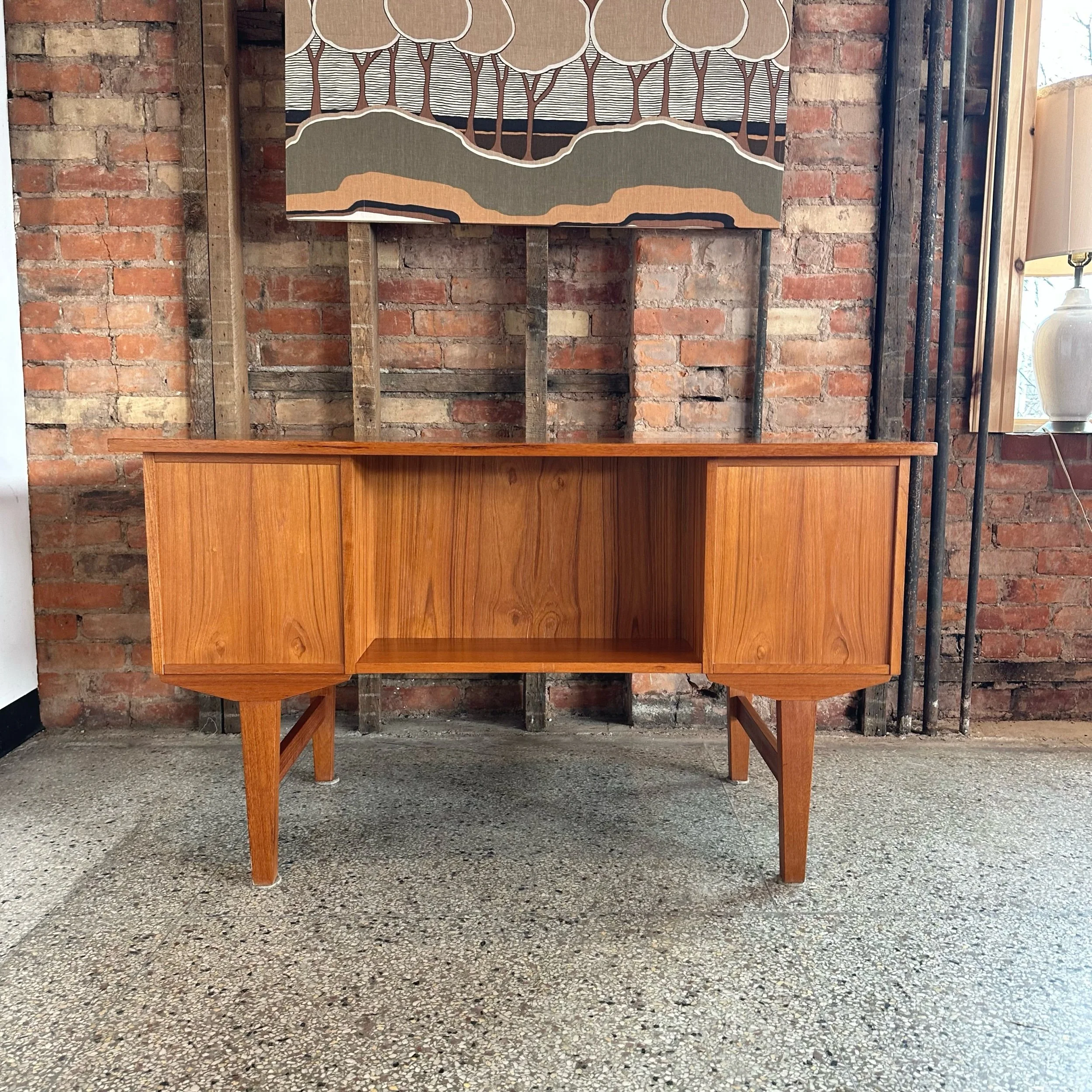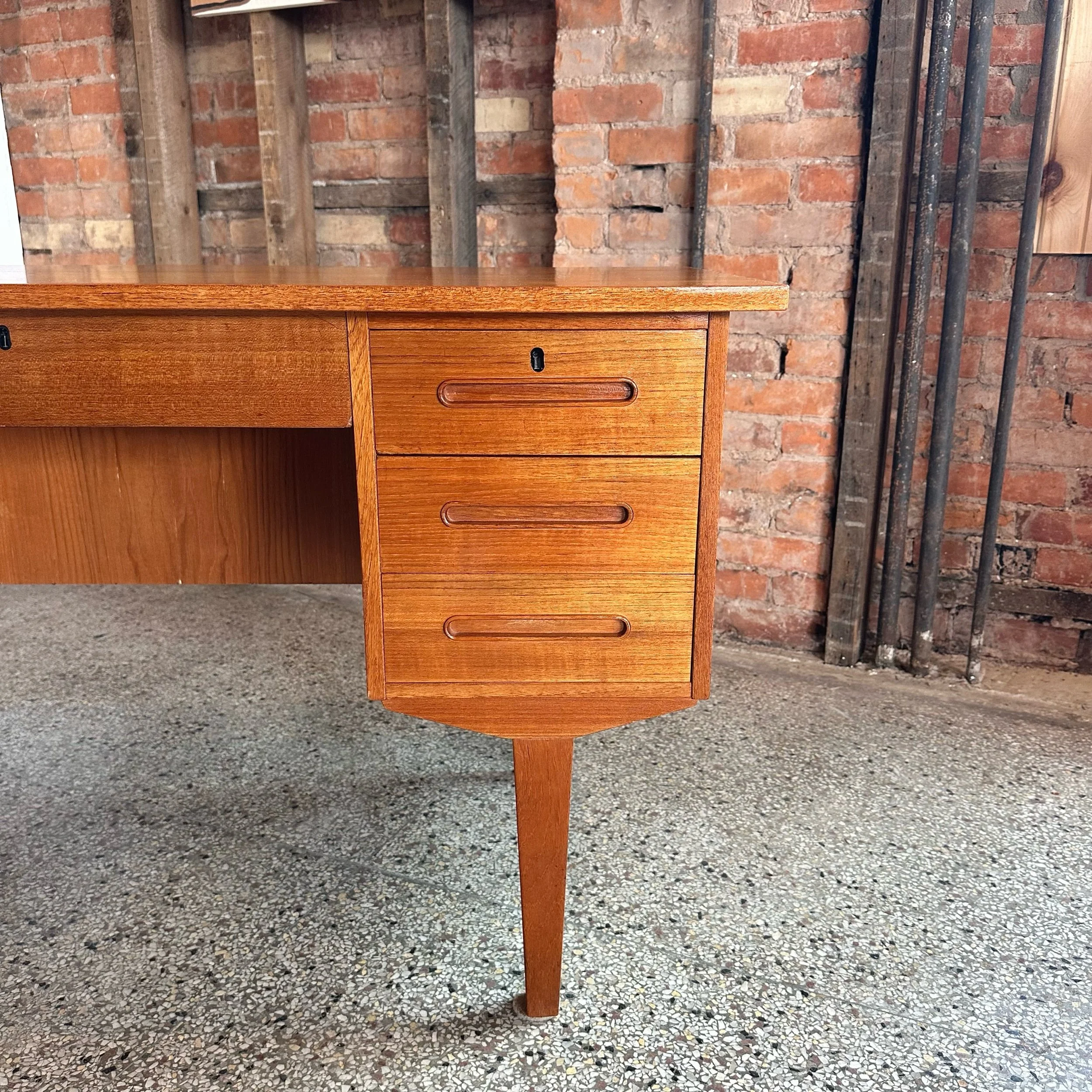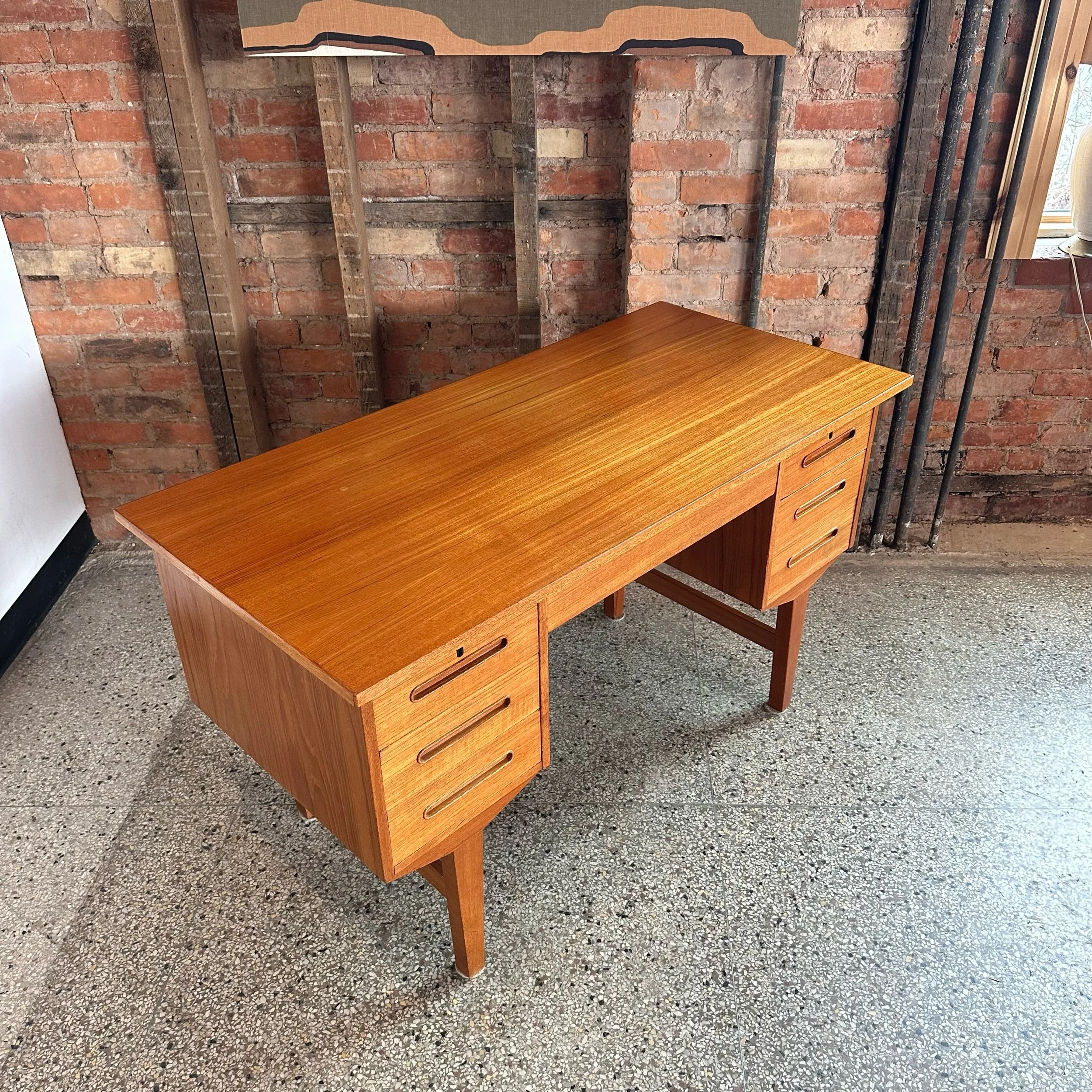 A beautiful danish mid-century, modern teak desk circa 1960. This beautifully preserved desk is stylish and functional. This piece has been fully refinished and is in fabulous condition. Featuring twin pedestal legs and six functional sliding dovetail teak drawers.
