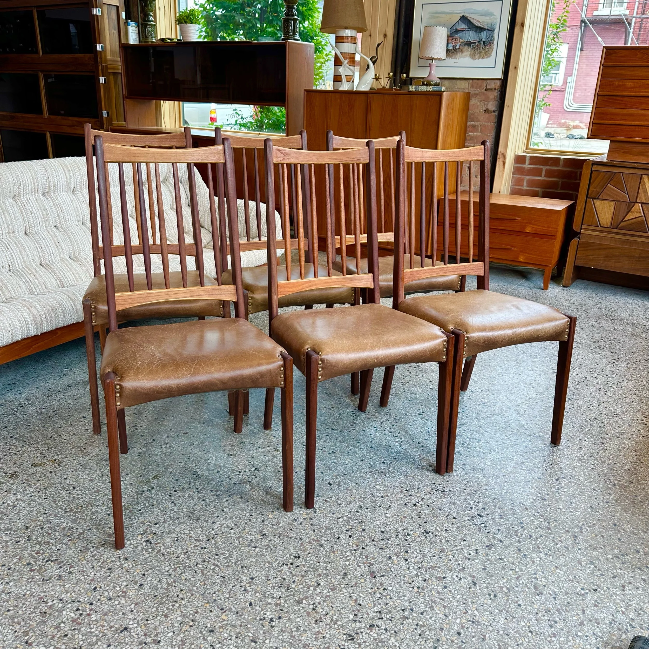 These beautiful dining chairs are sturdy and stunning! With original Hyde leather upholstery, recently refinished frames treated with teak oil.