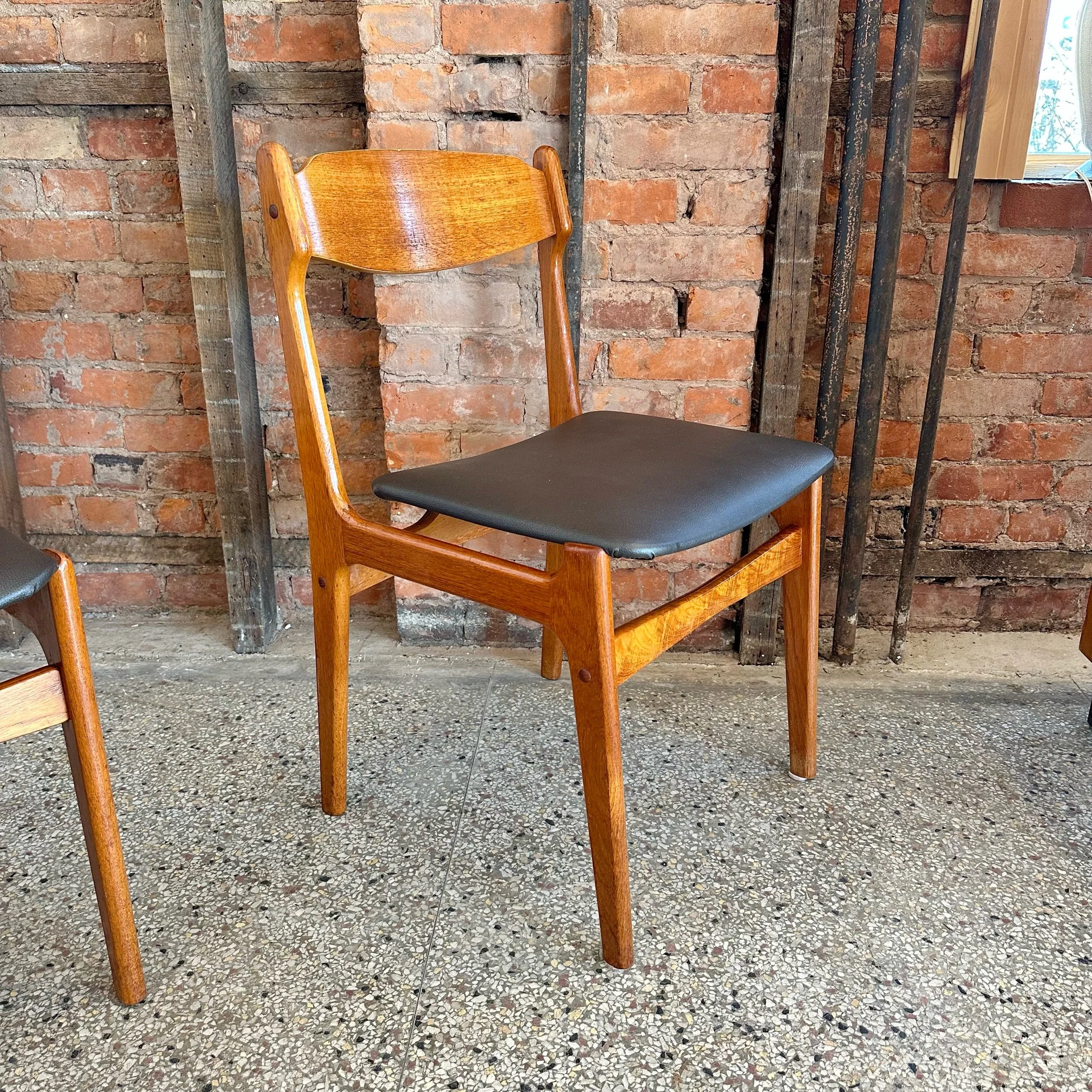 This is a set of four vintage Danish dining chairs made from warm teak wood. Designed in the famous “Erik Buch” style and made by findahls møbelfabrik in Denmark. They feature smooth, curved frames that aren’t just stylish—they’re built to be comfortable and support your back.