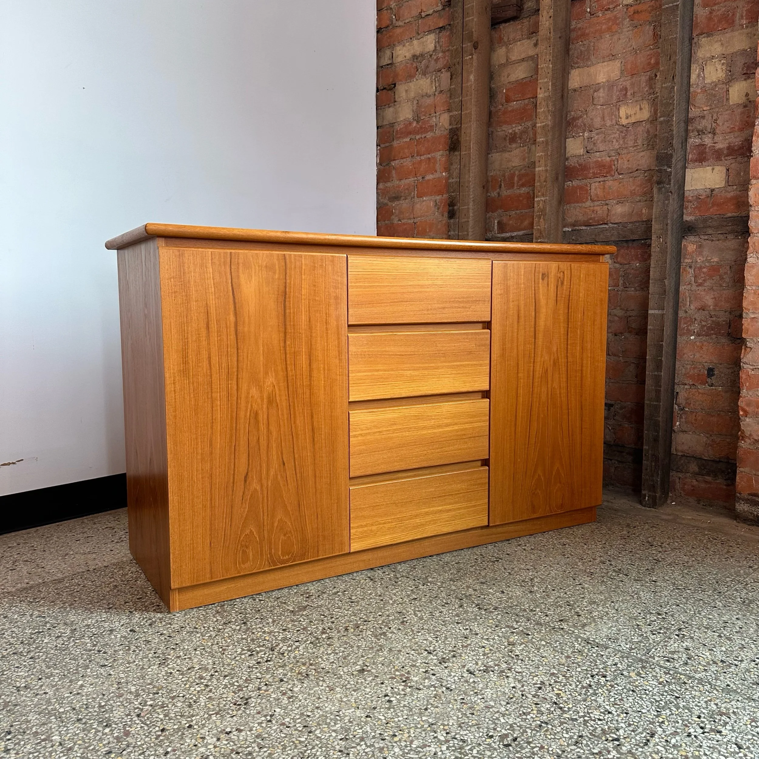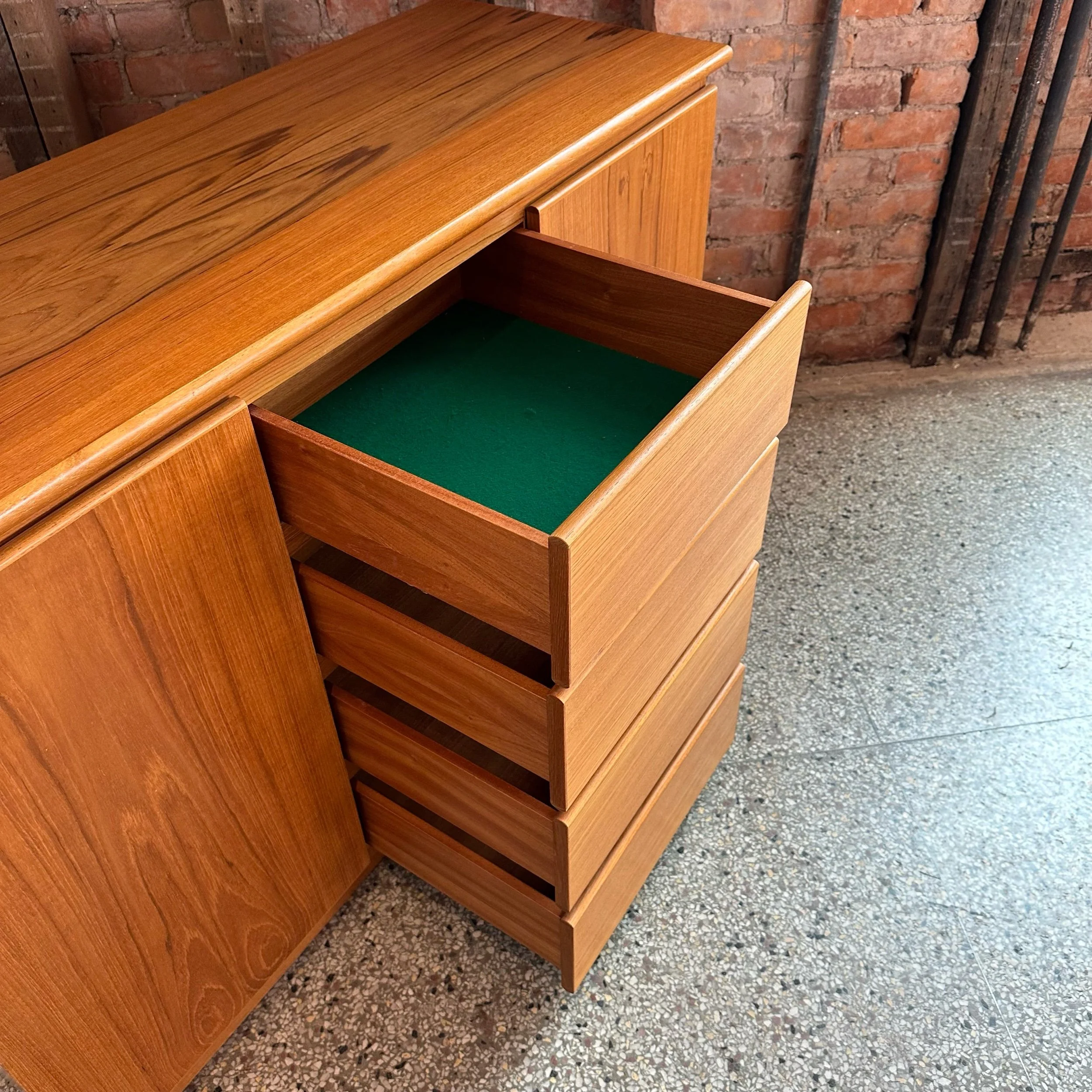 A beautiful teak mid-century modern sideboard. The stunning sideboard cabinet features five soft clothes sliding drawers and two large swing doors with ample storage inside. This beautiful piece is in pristine condition has been very well kept. Completely refinished and re-oiled in like new condition.