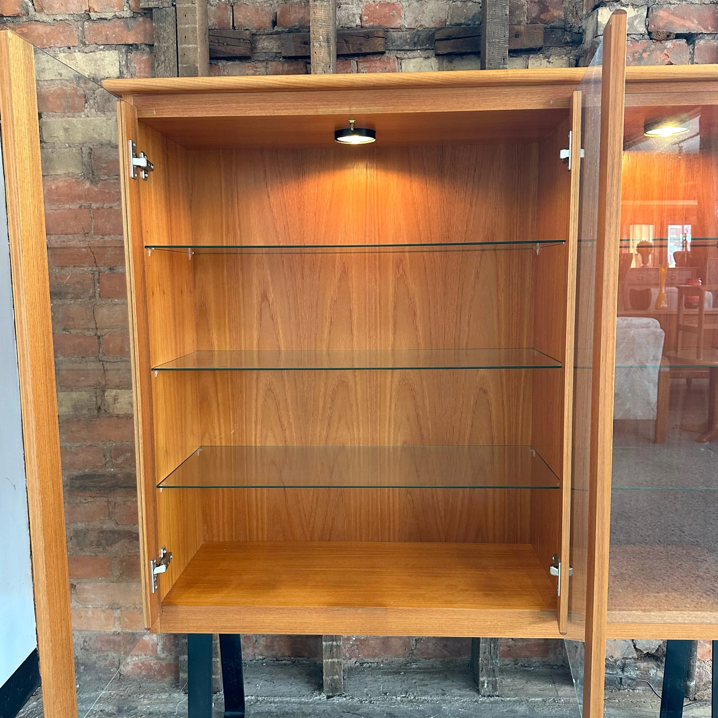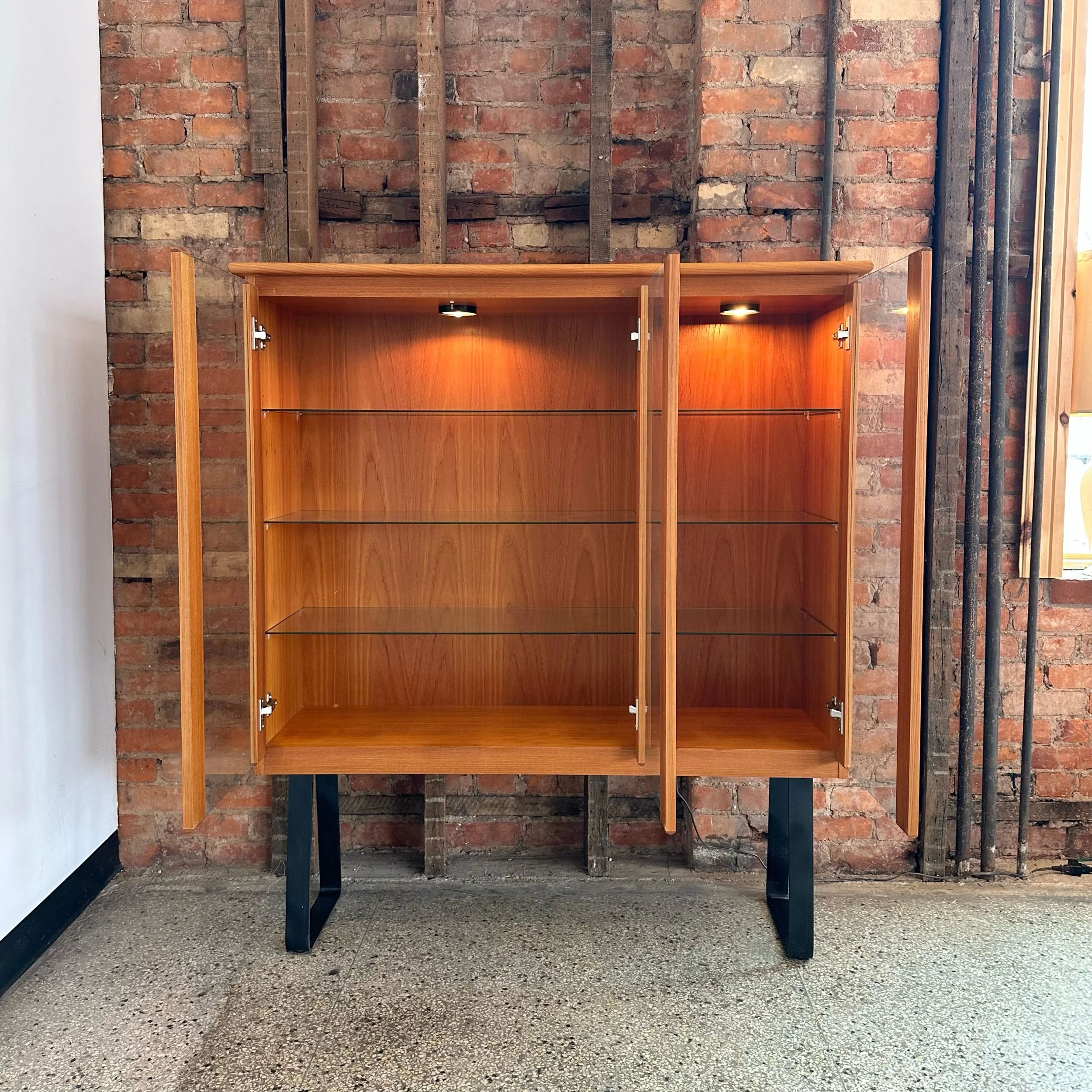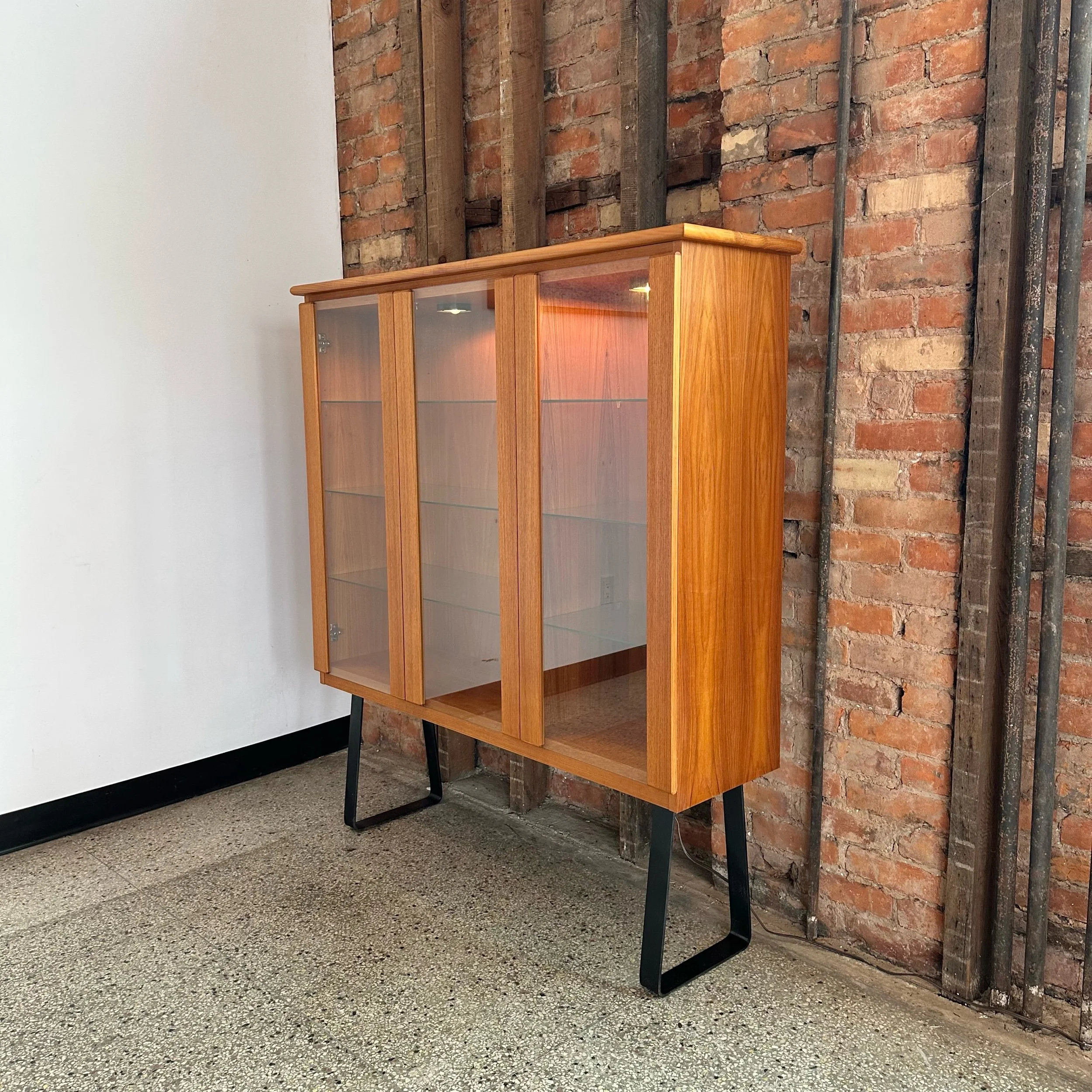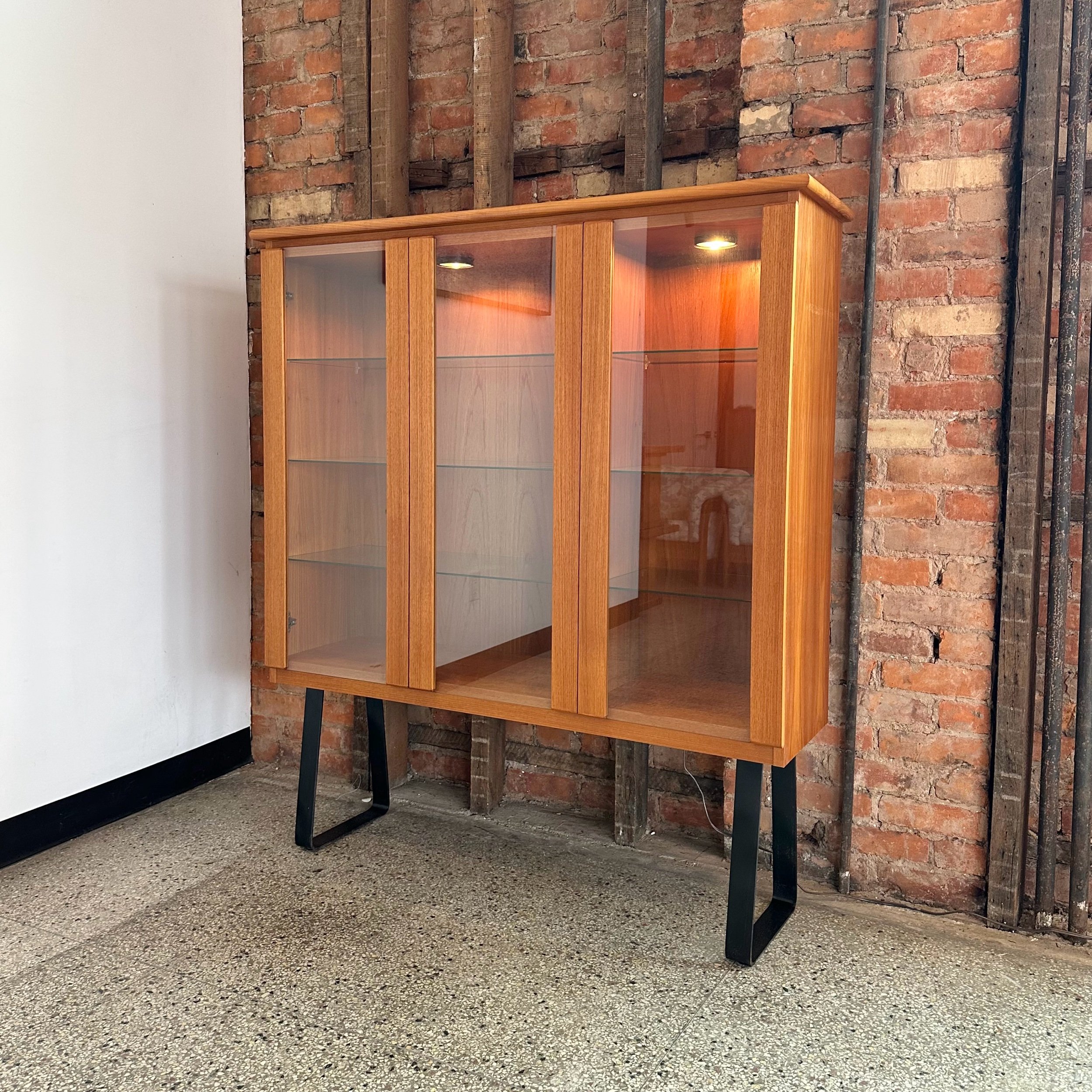 This beautiful piece features are fully lighted display and three glass functioning swing doors with inner glass shelving. Beautiful craftsmanship and in fantastic condition, sitting on black solid steel legs. A beautiful functional piece for a living room, display or entranceway.
