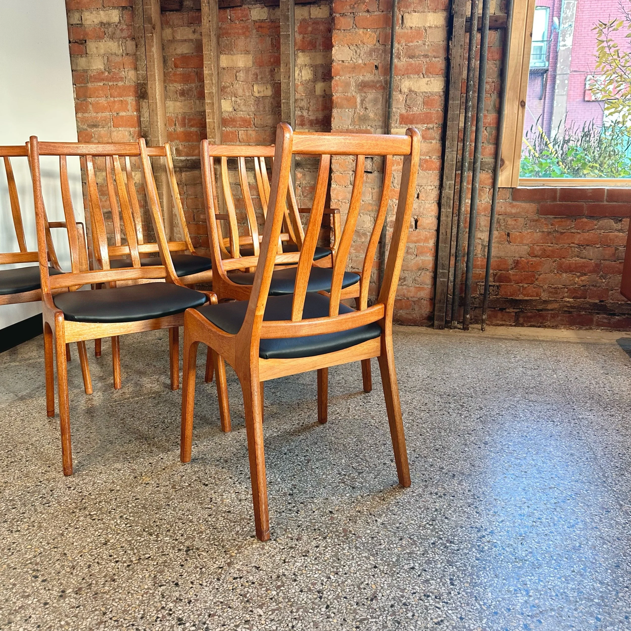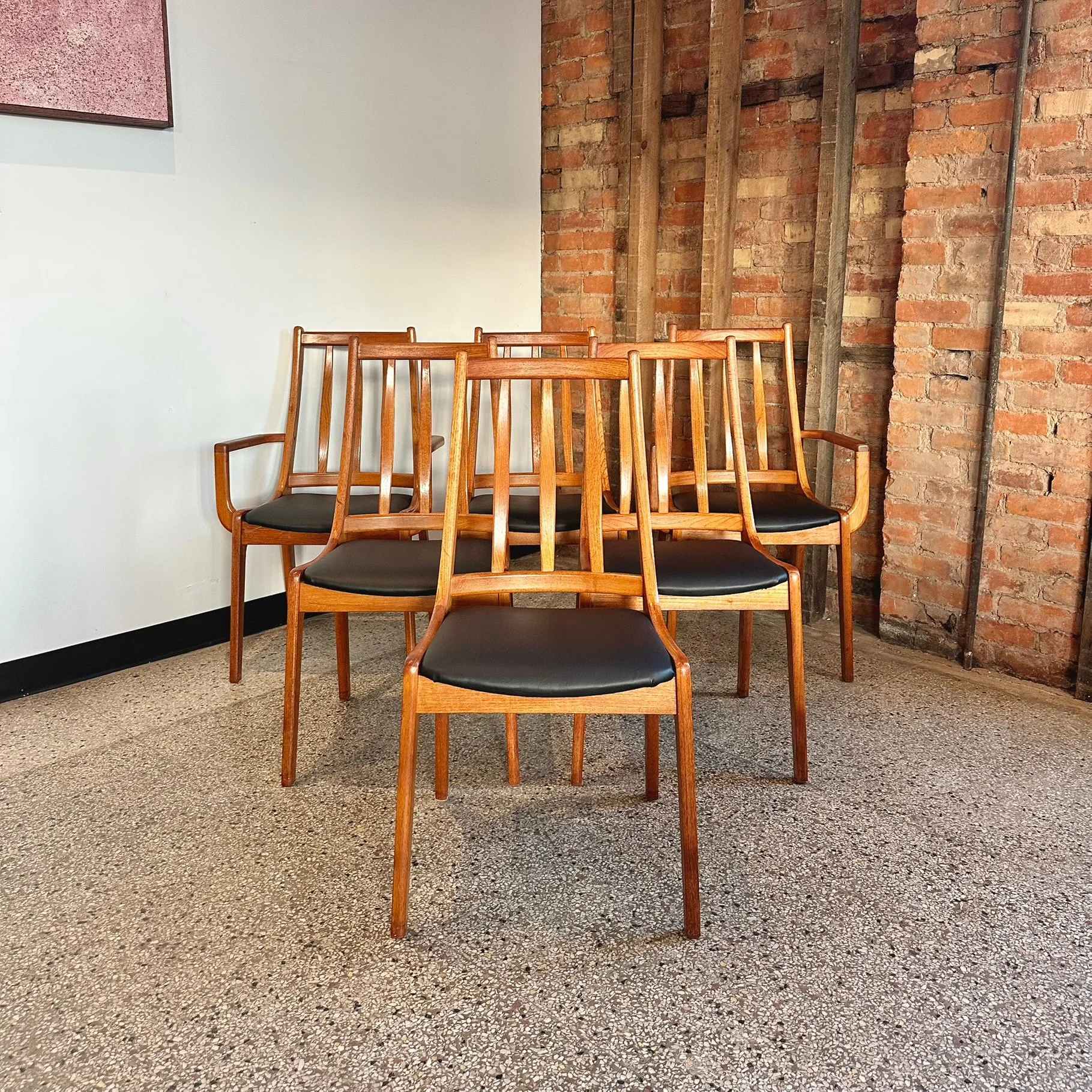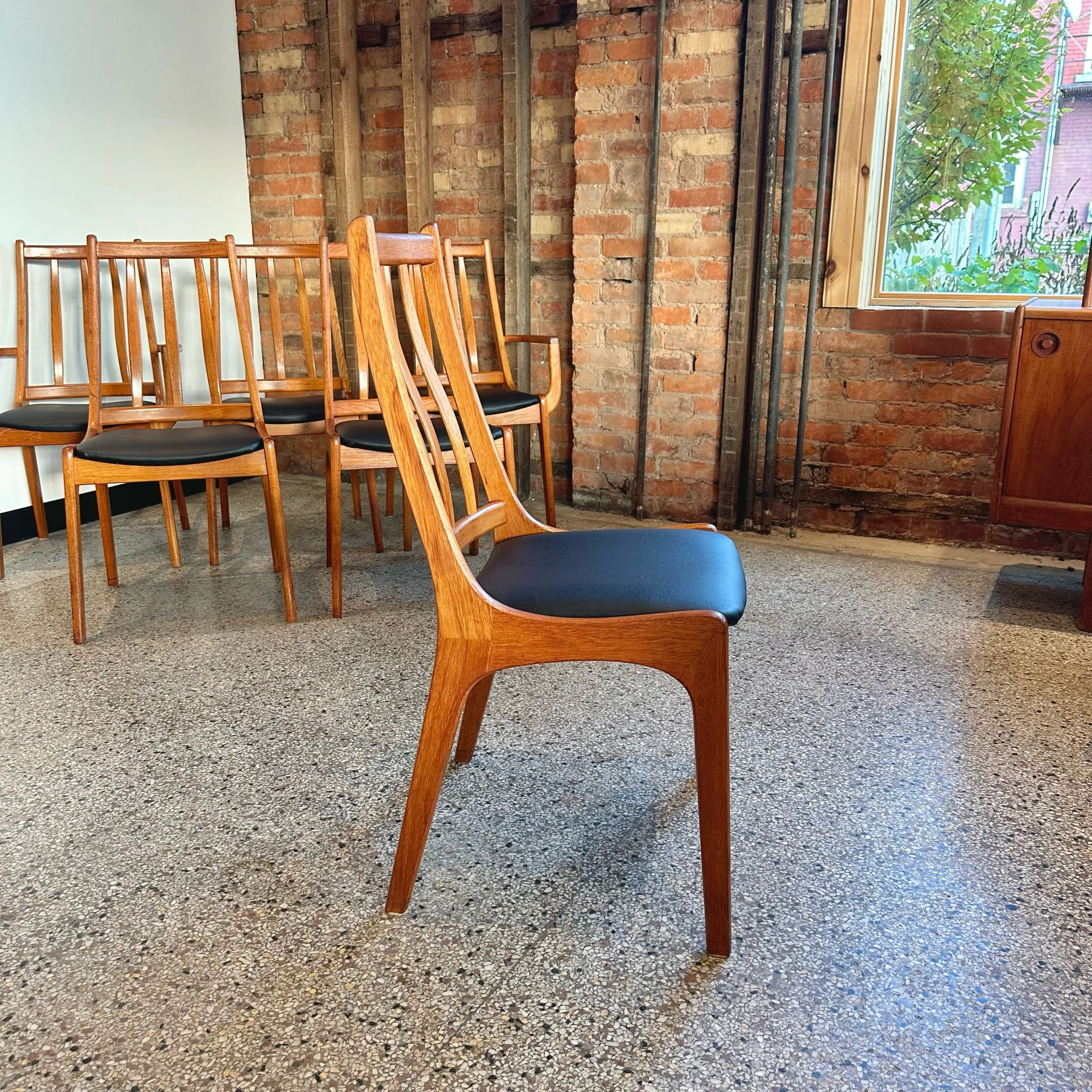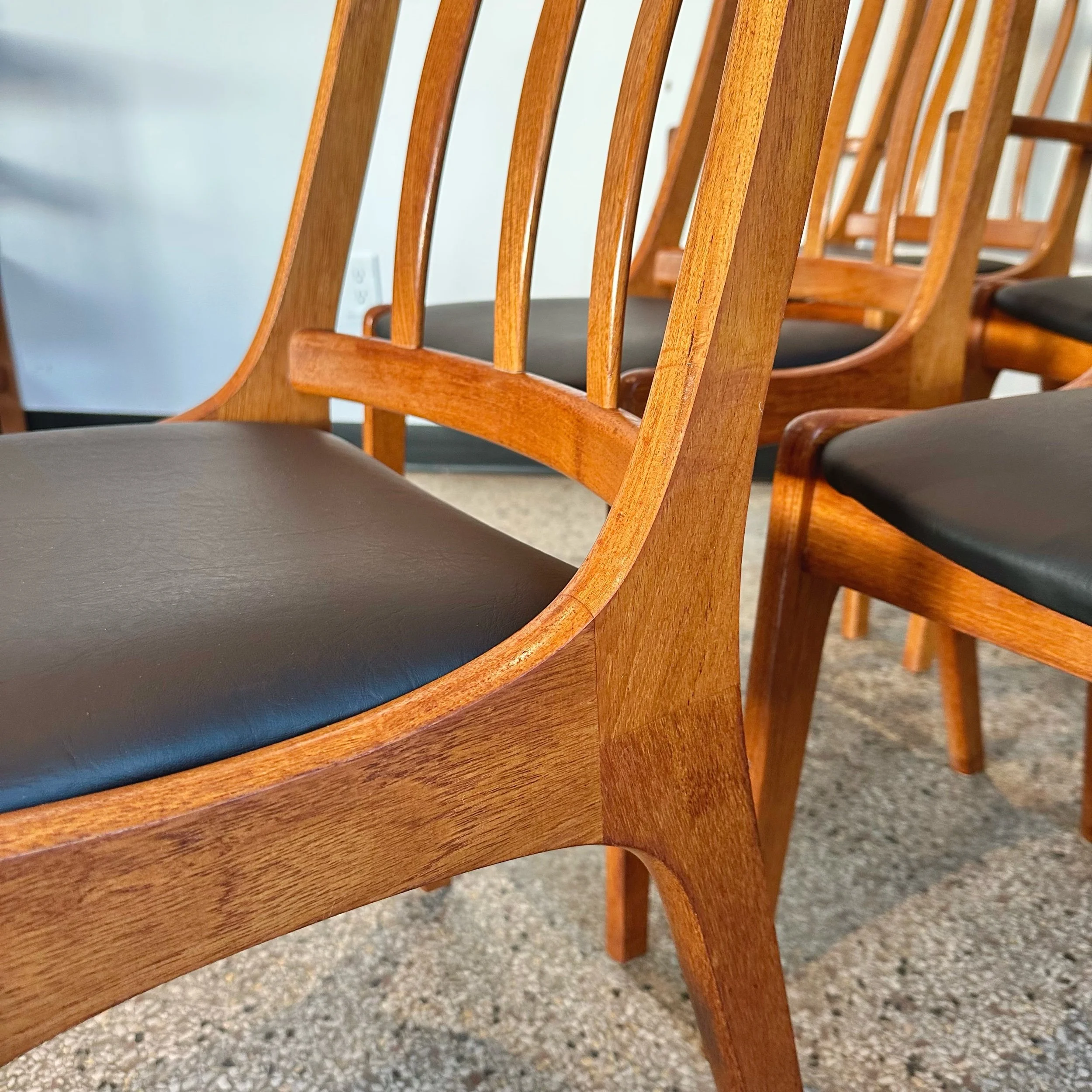 Stunning finish and quality, made entirely of solid Teak wood. Beautiful minimalist curves and all new foam and premium grade vinyl upholstery. There are 6 chairs total, two chairs with armrests and 4 chairs without. Fantastic craftsmanship. [$2750]