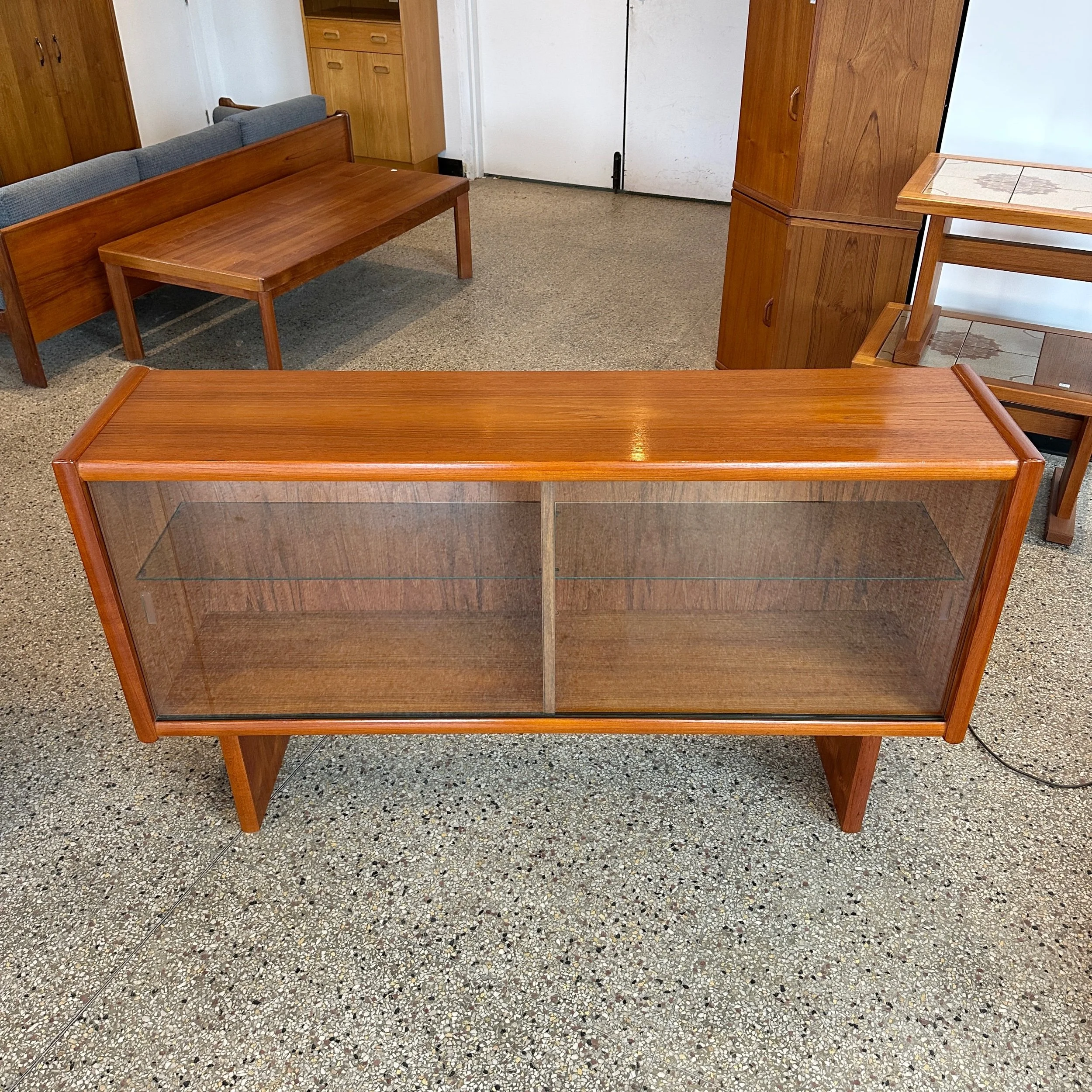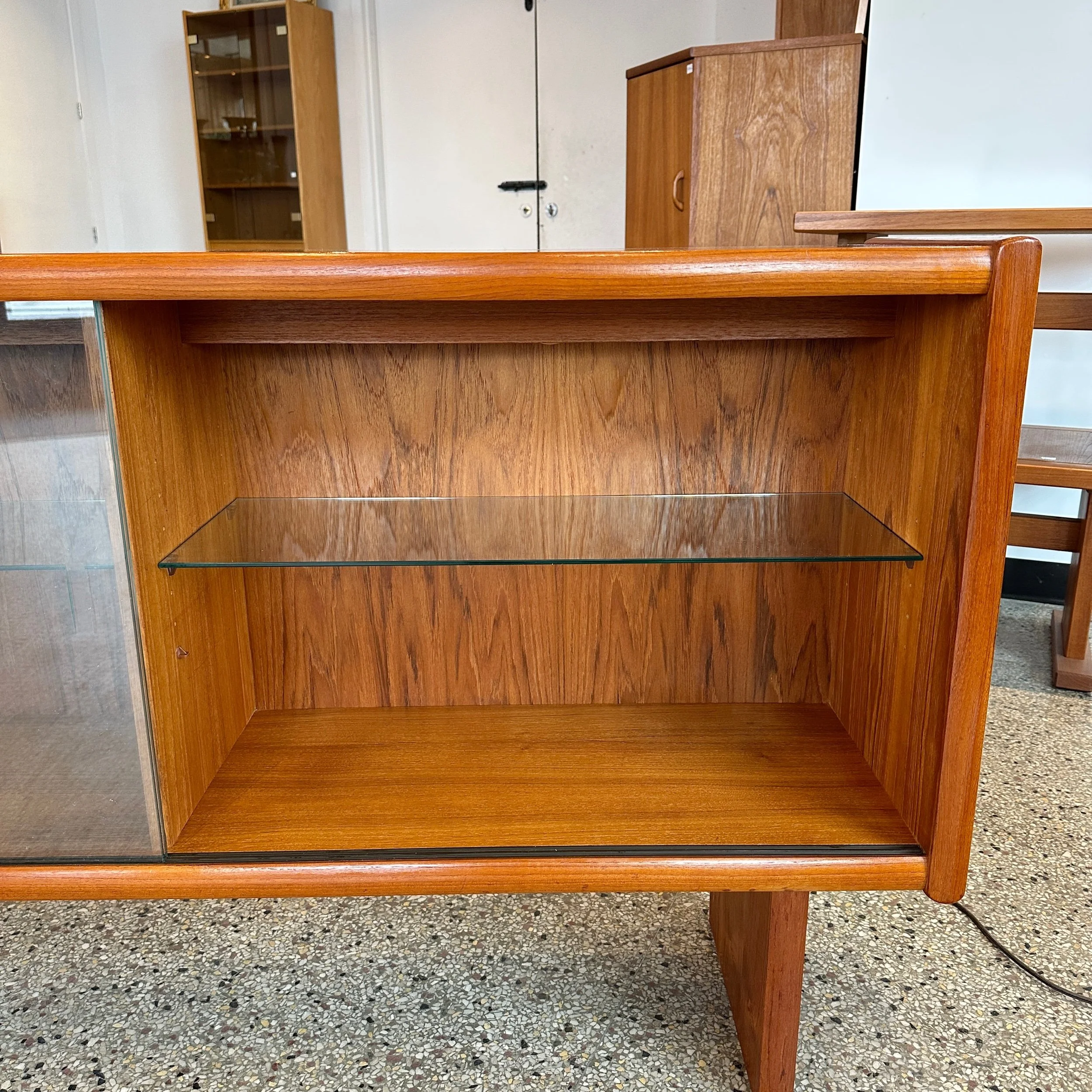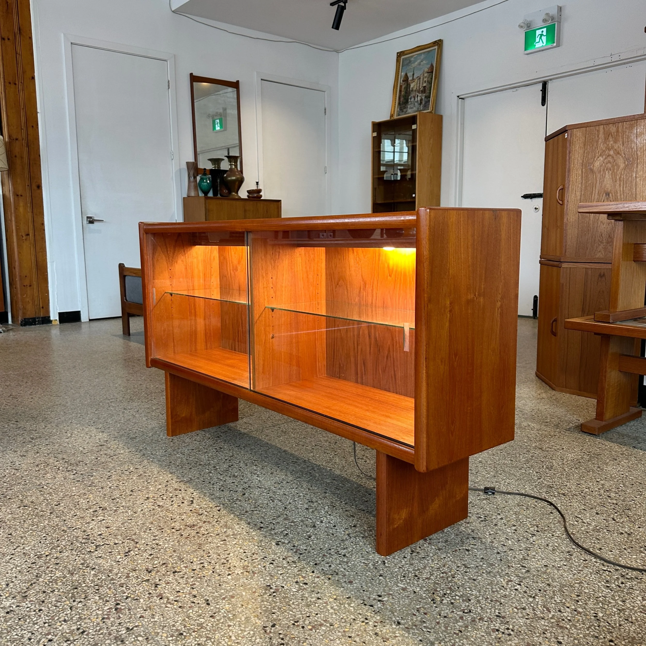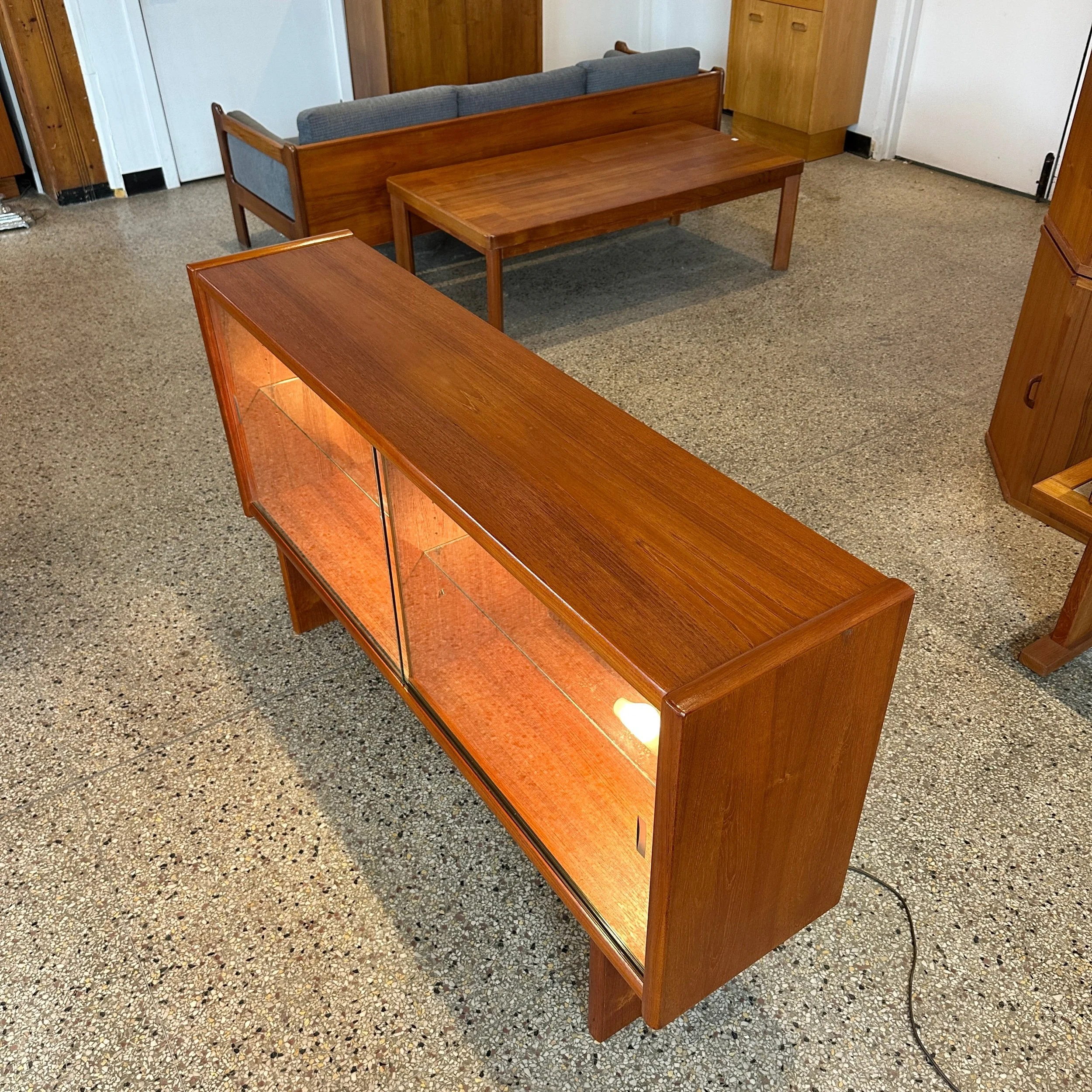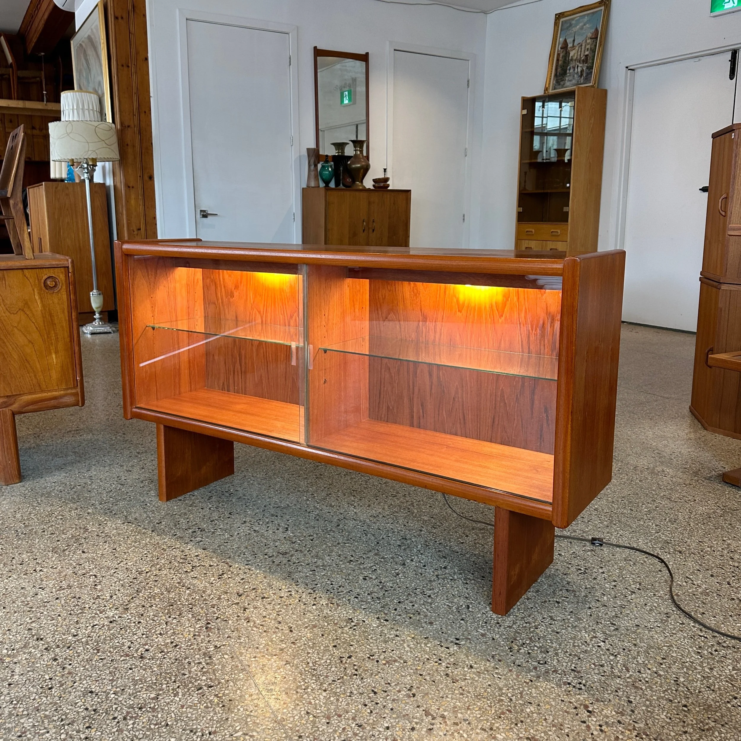 A beautiful mid century modern credenza display. This piece has been completely refinished and is in fantastic condition. Featuring two large glass front sliding doors, two glass shelves inside and has back lit hidden lighting! A very functional piece for a TV stand, mini bar or dining room credenza.